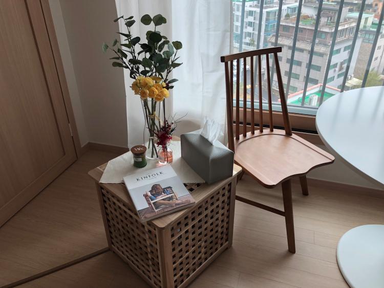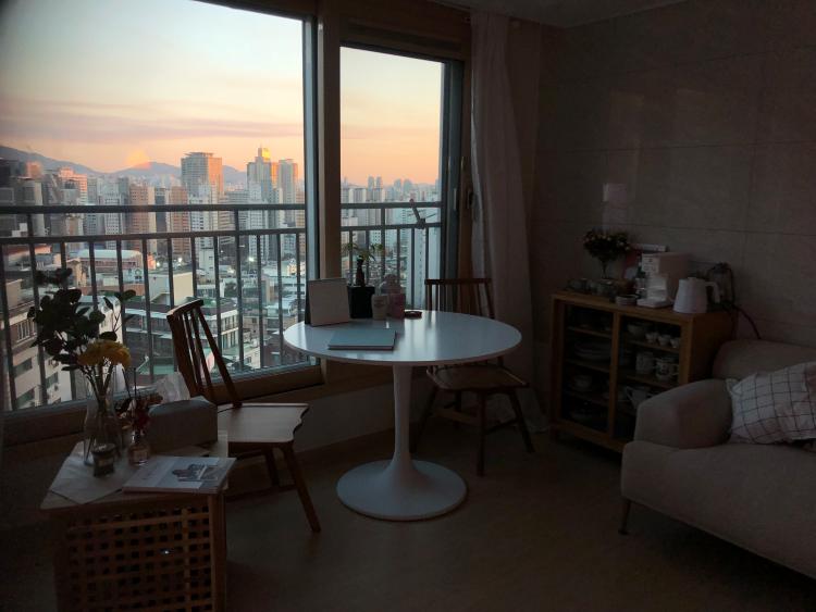 원래 테이블 자리에 있던 원형 테이블과 원목 의자는 창가 쪽으로 배치했어요! 나름 야경이 괜찮아서 건물들 보며 커피 마시는 공간을 극대화하기 위해 뒤쪽으로 조그마한 홈 카페(?)를 만들었습니다.