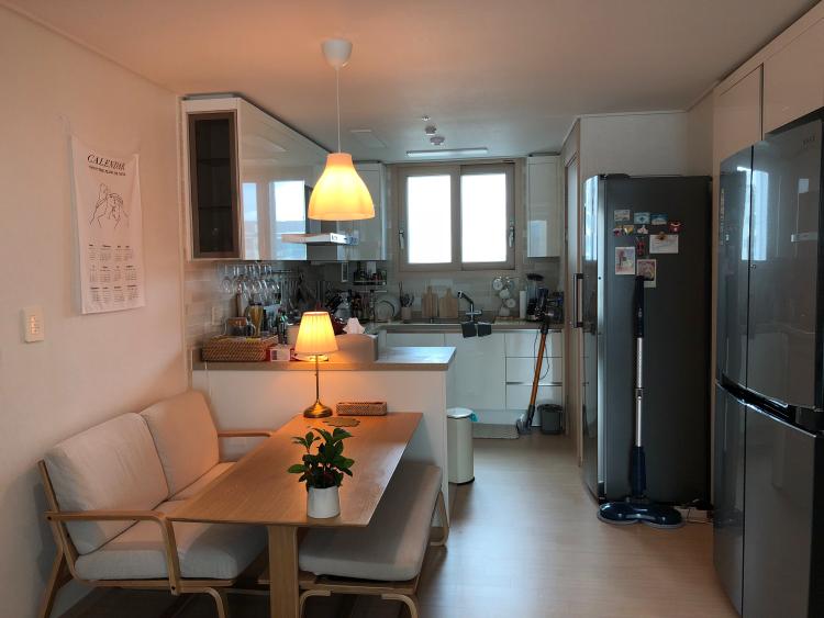 전체적인 주방의 모습이에요. 작은 집이지만 주방이 꽤 크게 나와서 좋아요! 높이가 낮은 다이닝 테이블을 놓았어요.