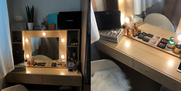 여긴 독립된 저만의 공간이에요. 제가 쓰는 화장대는 파로마 제품인데 수납도 좋고 조명도 들어오고 콘센트까지 있어서 정말 실용적이에요!