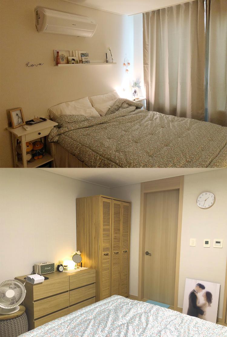 안방의 포인트는 템퍼침대와 빔프로젝터에요. 전동침대라 원하는 각도로 조절해서 영화나 드라마를 보고 있어요!