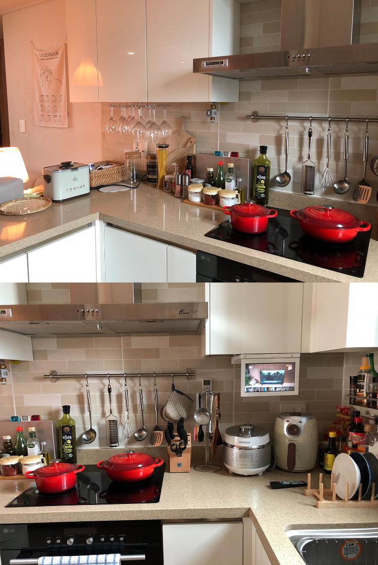 생각보다 요리가 즐거워서 점점 부엌살림이 늘어나는 중인 약간 너저분하지만 편리한 주방이에요. 주방도구 거는 저 스텐봉은 완전 효자템.