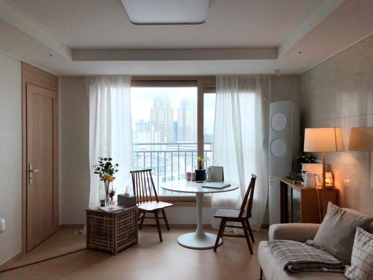 신축 아파트라 원래 인테리어 자체가 화이트 + 오크 느낌이어서 가구도 원목 위주로 배치했습니다.^^