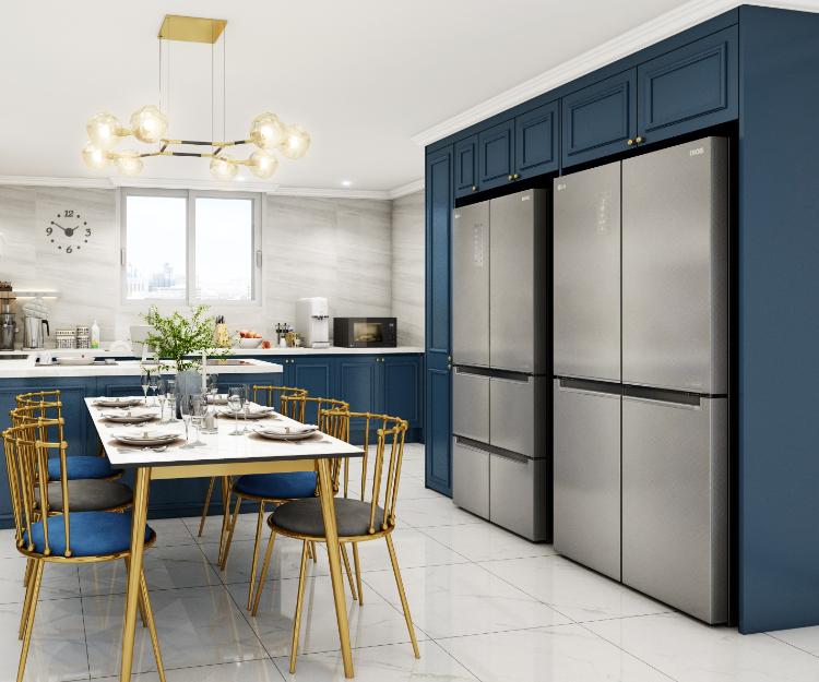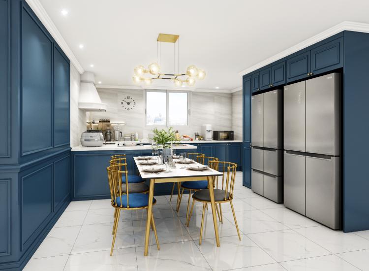 혼수품이었던 냉장고와 김치냉장고 크기와 딱 맞게 빌트인으로 연출하니 공간이 정말 깔끔해졌어요. 전체적으로 공간이 자칫 너무 무겁게 느껴질 수도 있을 것 같아, 디테일한 포인트는 모두 골드로 주었습니다. 식탁세트와 조명은 제가 정말 신경 써서 고른 제품이에요.