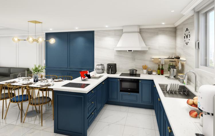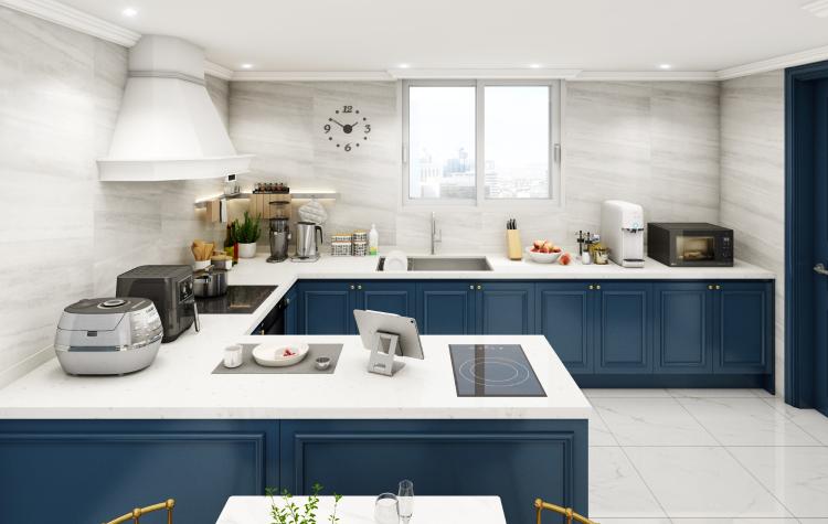 “제가 시간을 가장 많이 보내는 주방이 더 우아한 느낌이 되길 원했어요. 블루 컬러의 포인트로 더 깔끔해 진 것 같아요”