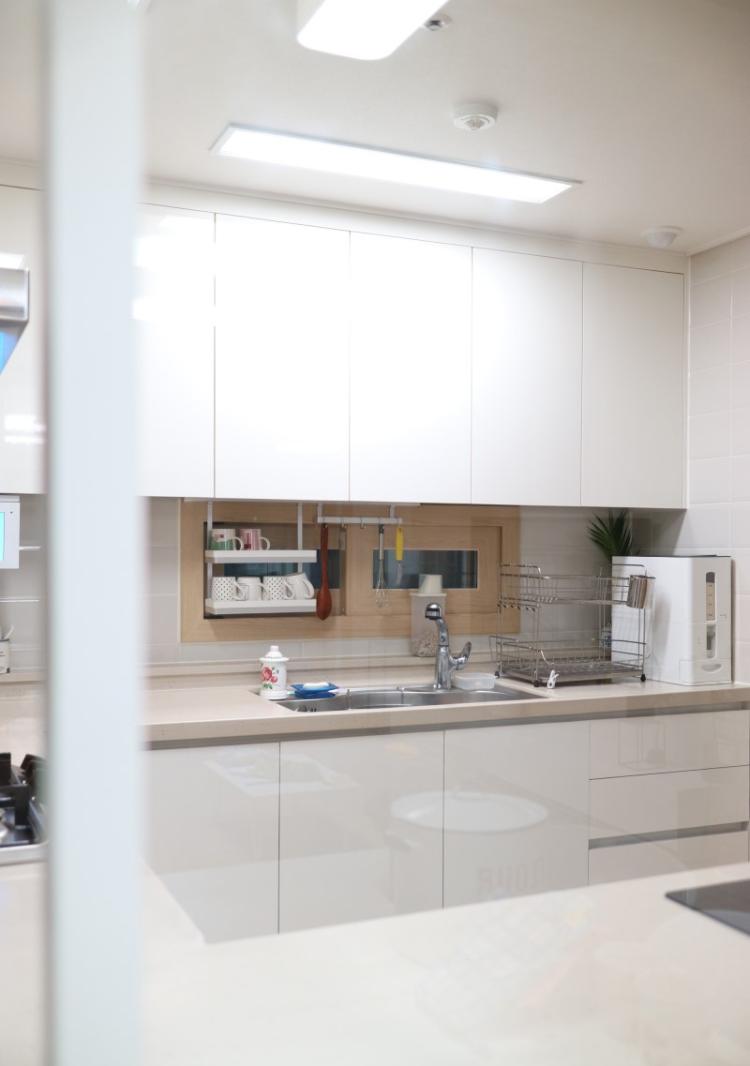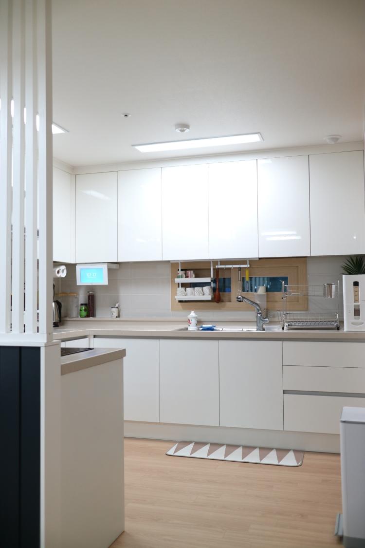 아이보리색의 상부장과는 달리 짙은 갈색톤의 수납장들을 전부 화이트톤으로 페인팅해주었어요.