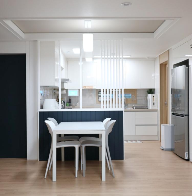 식탁과 주방 사이에는 가벽을 셀프로 시공했어요. 작업할 땐 힘들어도 완성하고 나면 뿌듯하거든요.