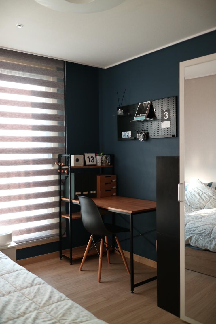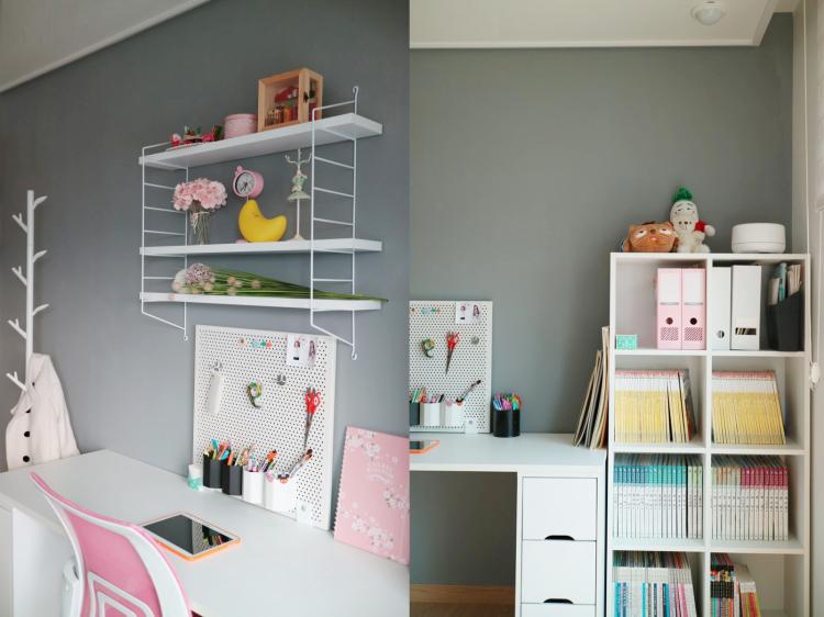 책상을 바꿔주고 벽지 페인팅을 해주었어요.허전한 벽에는 타공판으로 포인트를 주었지요.