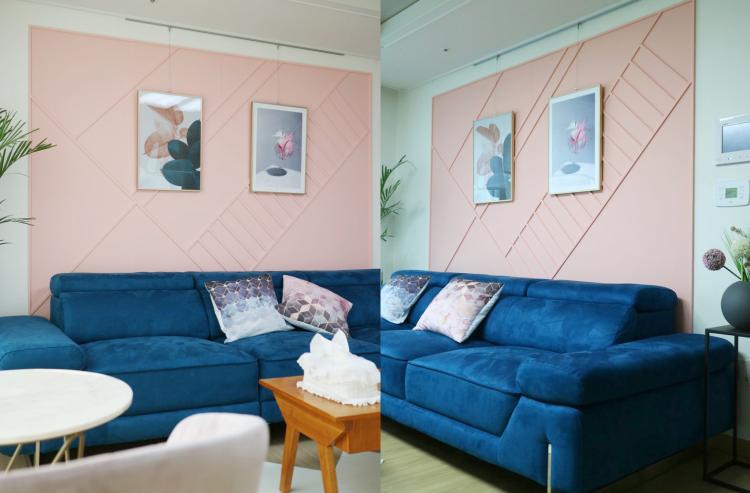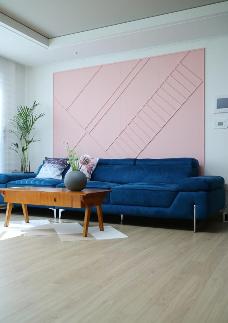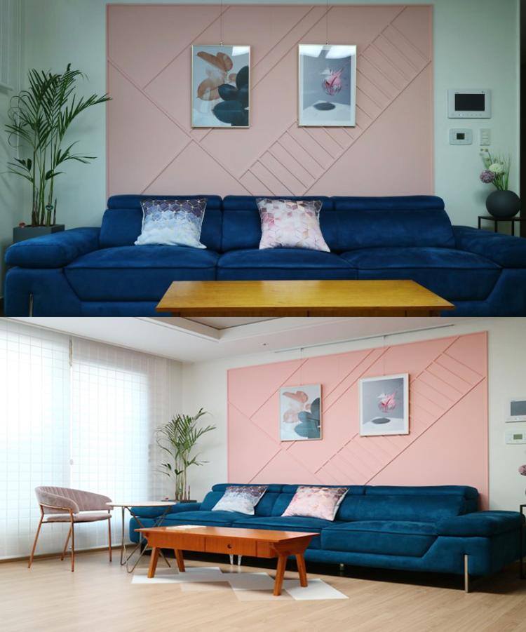 거실에는 프렌치 스타일에 웨인스코팅을 하고 소파에 어울리는 색을 찾다가 핑크로 페인팅을 하게 되었어요.