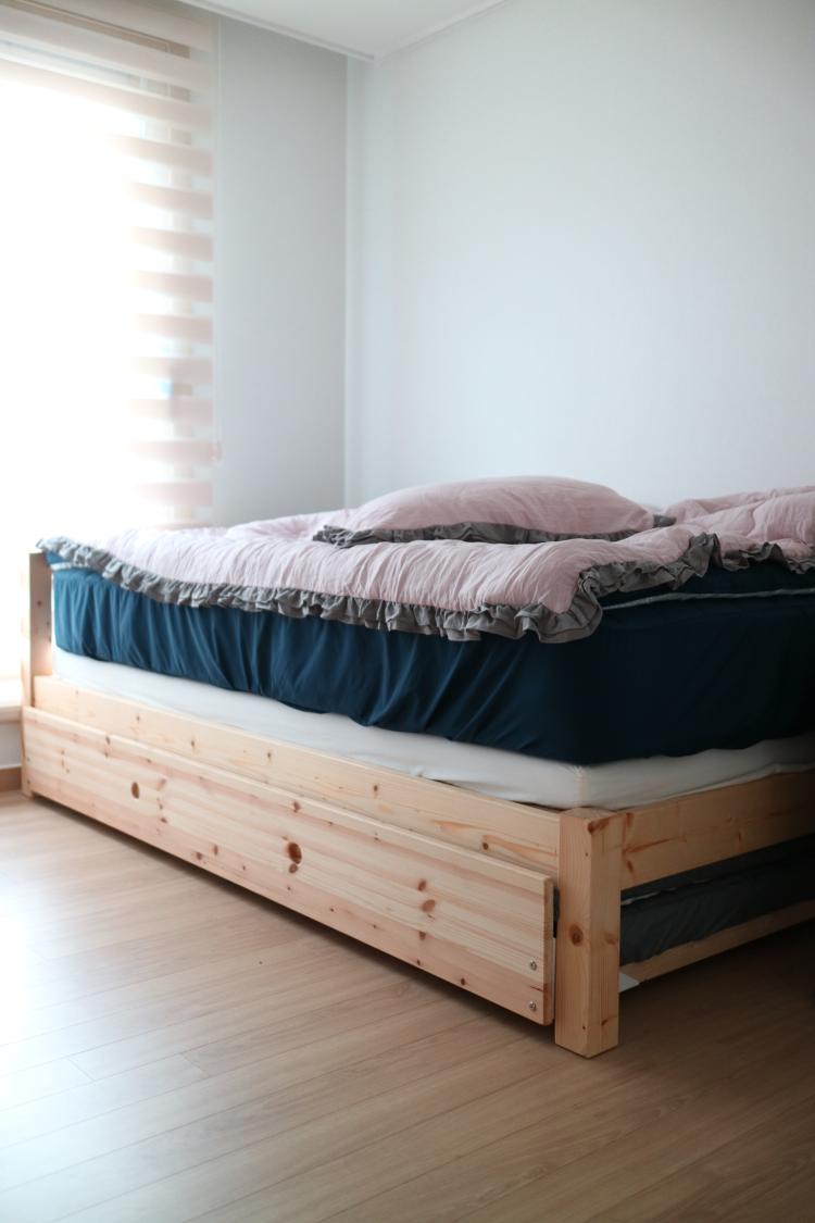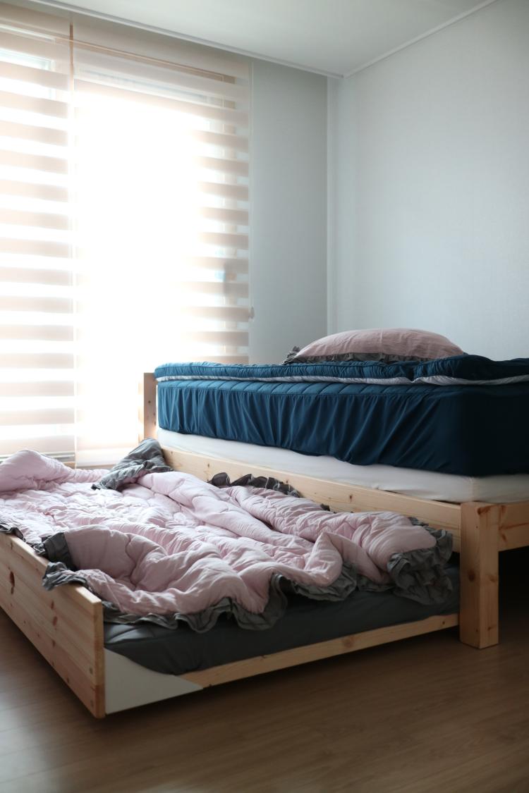 책상 뒤로는 슬라이딩 침대를 두었어요. 심하게 코골이는 하는 신랑을 피해서 제가 딸하고 같이 자거든요. 침대 틀이 이쁘지는 않지만 아래쪽 매트리스를 받쳐주는 곳이 튼튼하게 되어있어서 잘 선택한 듯 싶어요.