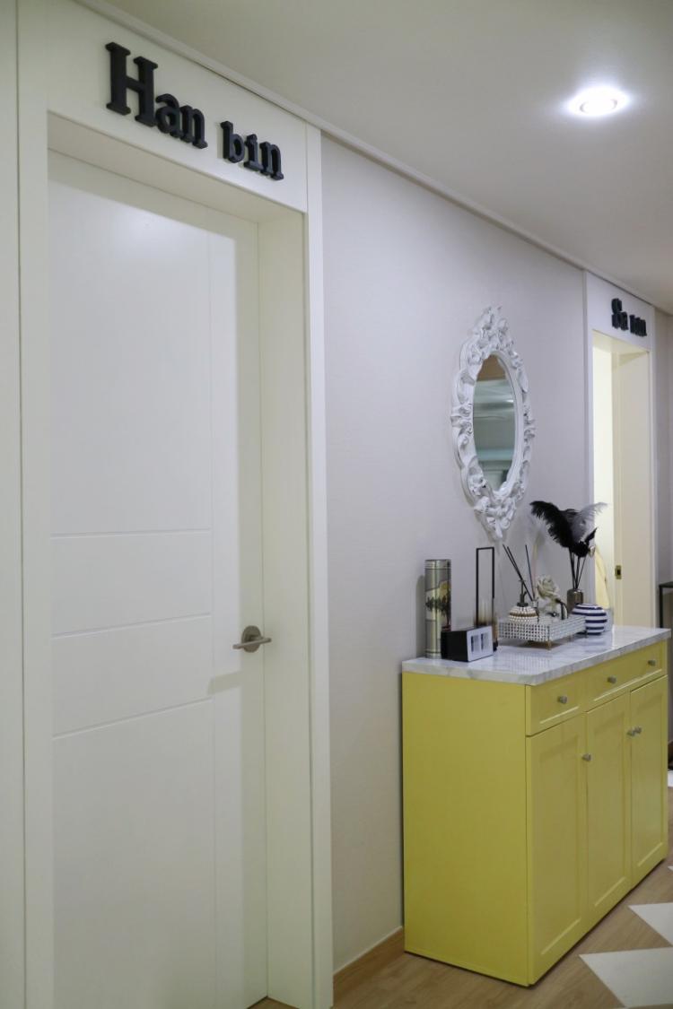 비어있던 벽에는 커다란 거울을 달아서 심심하지 않게 해주었지요.