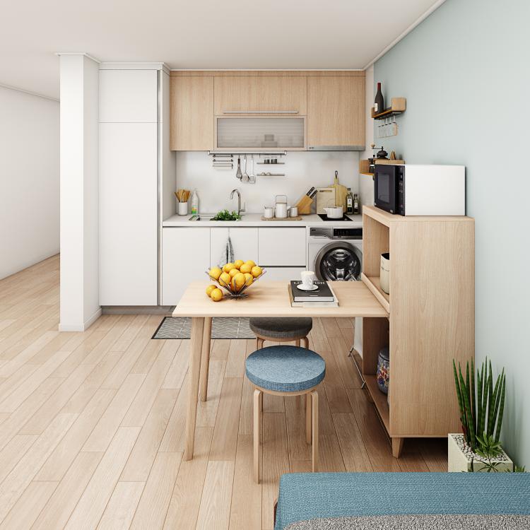 식탁 또한 수납공간이 있는 제품을 이용해 밥솥이나 전자레인지 냄비 등 주방기구들을 식탁 안에 배치했더니 주방이 더 깔끔해 보이고 좋더라고요.