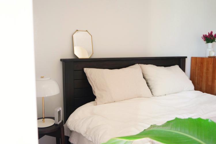 그리고 저희는 침대 옆에 ‘협탁’이라고 정의된 가구를 두지 않았어요. 대신 스툴을 활용하고 있는데요, 테이블 조명과 작은 온습도계 하나를 올려 두기에는 크기도 충분하고 손님이 오시면 다시 스툴로 사용하면 되니 여러모로 마음에 듭니다😊