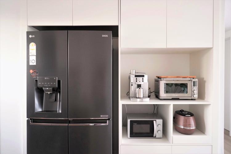 홈카페와 요리 공간으로 키에 맞는 선반을 만들고 이곳에 매일 사용하는 커피머신과 오븐, 그리고 전자레인지와 전기밥솥을 두니 사용하기도 편하고, 보기에도 깔끔하게 정돈된 느낌이 들어 아주 마음에 듭니다😊 그리고 위-아래에 마련한 수납 공간 역시 팬트리 공간이 따로 없는 작은 평수인 저희 집에서 아주 활용도가 높답니다.