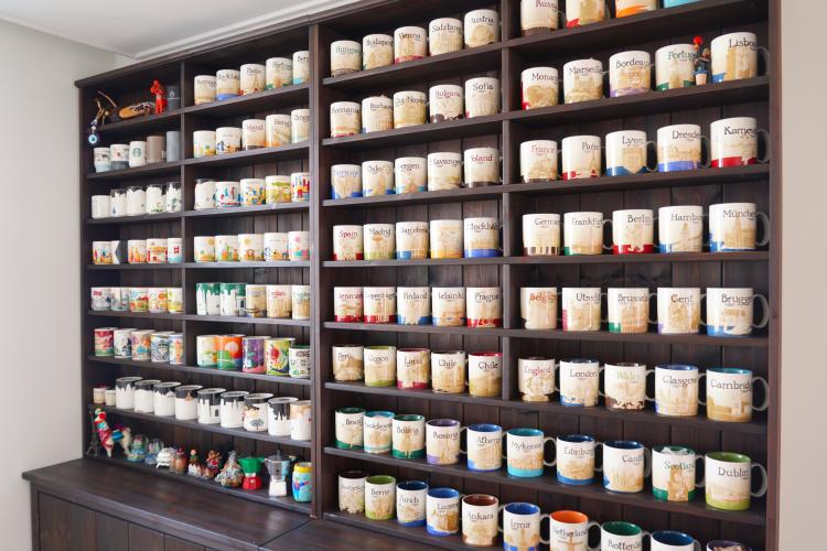 사진 속 많은 컵들은 남편이 오래 전부터 여행하며 모아 온 시티 머그컵이에요. 각 도시와 나라의 특성이 그려진 컵을 모으는 건 여행의 기억을 오래도록 간직하기 위해 시작했던 남편의 취미인데요, 여행하며 하나씩 모아온 게 이렇게나 많이 모였답니다!