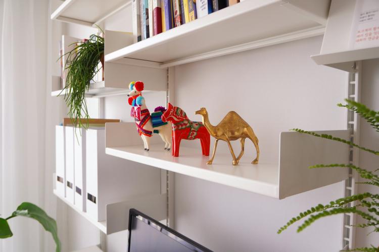 우선 선반은 책과 서류를 보관하는 책꽂이로 주로 사용하되, 때때로 저희 부부의 관심사가 담긴 소품을 올려 두는 전시 공간으로도 사용 중이에요. 그리고 옵션으로 선택한 화이트보드는 그때 그때 생각나는 것을 메모해 두거나, 함께 공유하고 싶은 내용을 붙여 두는 소통의 공간으로 사용하고 있답니다.