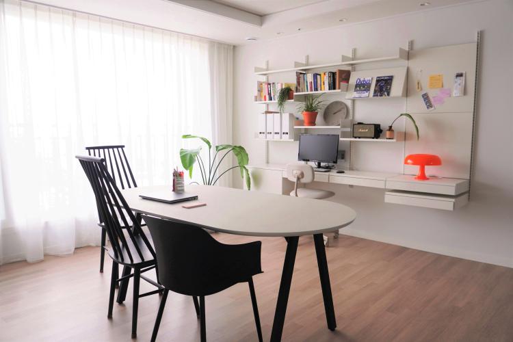 그 결과 저희 집 거실에는 TV와 소파 대신, 큰 테이블과 책을 놓을 수 있는 선반이 자리 잡게 되었고, 자연스레 거실이 서재이자 홈 오피스의 역할을 하게 되었답니다.