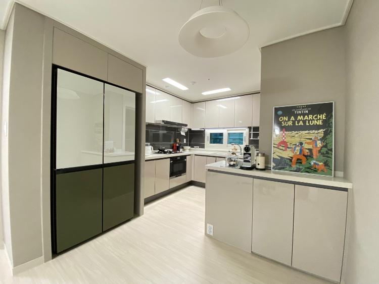 우리 집에서 제일 예쁜 가구가 식탁이라면 제일 예쁜 가전은 비스포크예요. 냉 툭 튀는 용납할 수 없다며 비스포크 키친 핏 프리스탠딩 모델을 골랐고, 광택이 있는 글램 화이트와 글램 올리브로 커스터마이징 했어요. 전체적인 주방의 분위기를 봤을 때 나름대로 최선의 선택이었다고 생각해요.