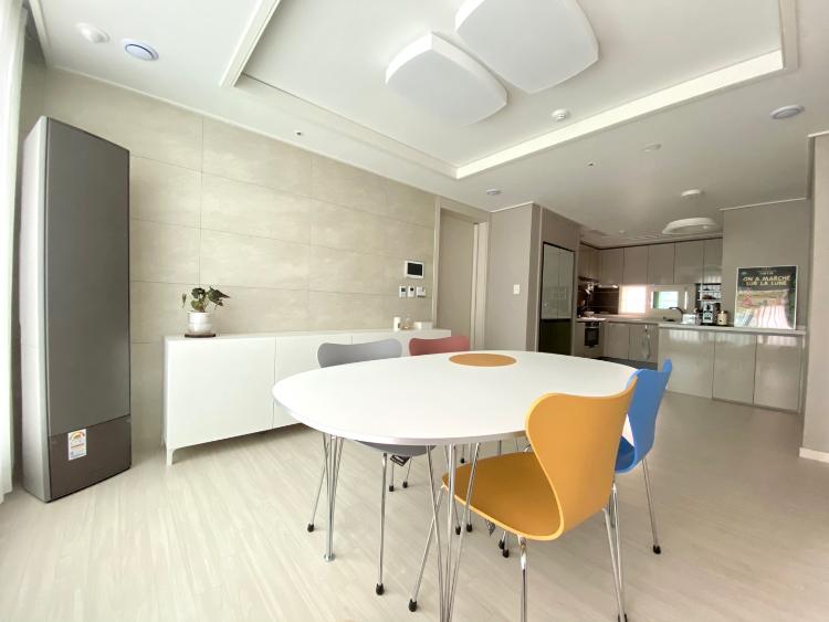 거실엔 TV와 소파를 두는 대신 프리츠 한센의 6인 식탁을 정중앙 두었어요. 지인들을 초대해 맛있는 음식을 해서 나눠먹고, 홈 카페 놀이를 즐겨요. 집을 최대한 밝고, 심플하게 꾸미려고 노력했어요. 기본 벽지와 싱크대가 그레이 색이라 가구는 대부분 흰색으로 구매했더니 조금은 단조로운 느낌이 들어 식탁의자를 각기 다른 색상을 골라 포인트를 주었어요.