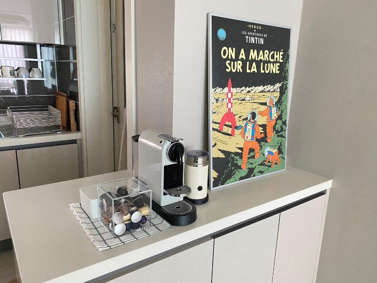 주방 한쪽에 위치한 소박한 우리집 홈카페입니다. 집들이 선물로 받은 커피머신을 잘 사용하고 있어요. 땡땡 포스터는 나름 냉장고와 어울리라고 초록색이 많이 들어있는 작품을 골랐답니다.