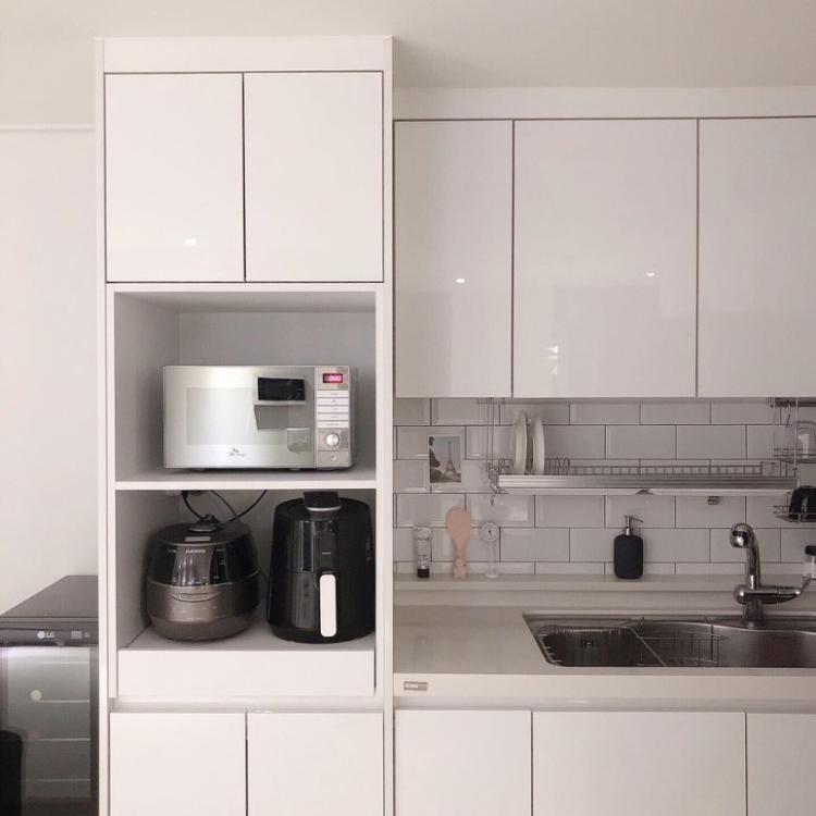 부엌도 최대한 하얗게! 관리가 힘들긴 하지만 어려운 건 아니에요. 찌든 때 스프레이 같은 걸로 뿌려주면 금방 닦이더라고요. 나의 귀여운 살림 가득한 부엌. 애정 쏟아부어주고 있지요. 헤헤