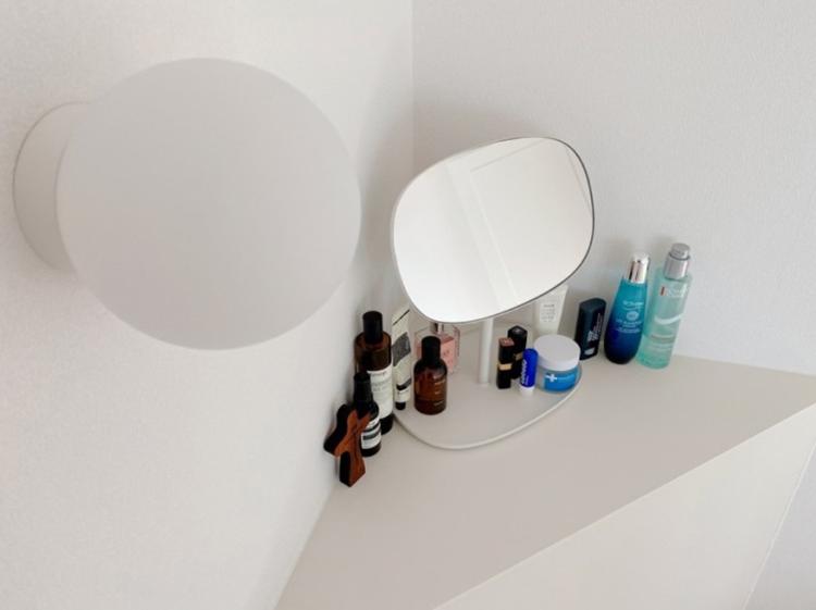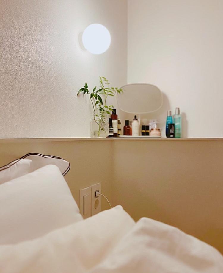 어느 순간부터 색조화장을 간소화하면서 화장대는 저에게 꼭 필요한 것들만 올려둘 수 있는 작은 공간이면 충분하다고 판단해서 만들게 된 공간입니다. 전기 공사 전에 미리 헤드보드에 벽 등 스위치와 콘센트를 설치해달라고 요청드렸더니 동선이 매끄럽게 연결되어 편리하게 사용하고 있어요.