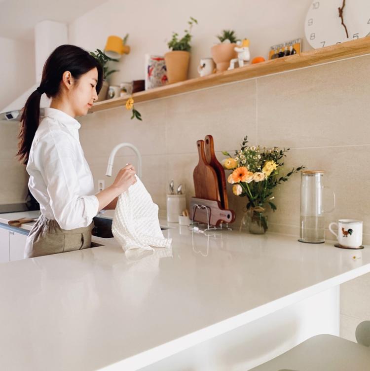 화이트 주방에 맞추어 설치한 화이트 수전과 세제 통, 수저 통. 작은 물건 하나를 사더라도 집의 톤 앤 매너를 고려해서 사는 편이에요.