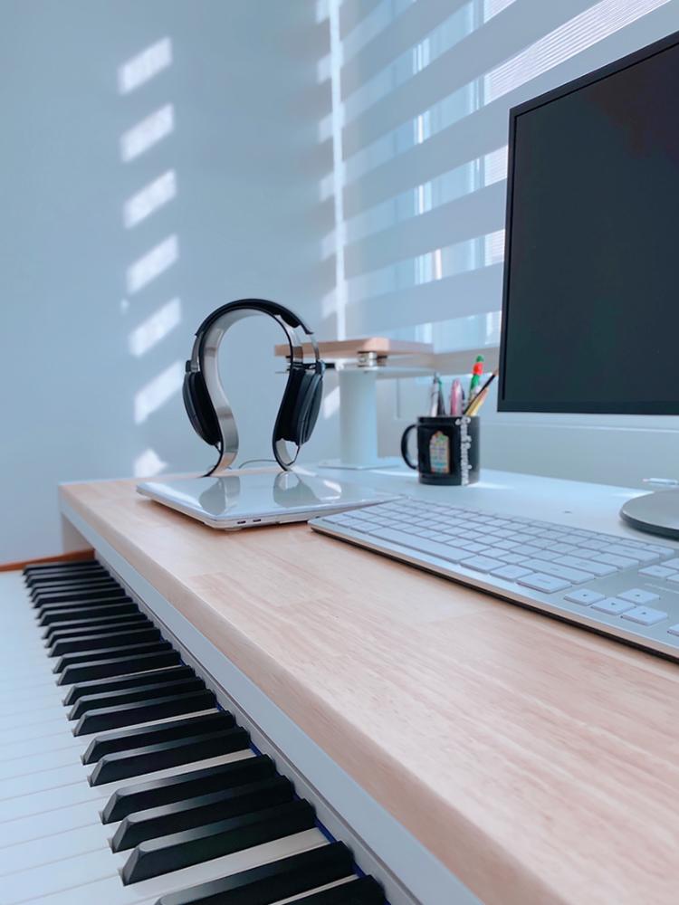 화이트 철제와 원목의 조합으로 군더더기 없는 이 책상은 이사하면서 새로 산 음악 작업용 책상이에요. 레일 선반 위에 이렇게 건반을 둘 수 있어서 공간 활용뿐만 아니라 작업할 때도 효율적이라 만족하는 제품이에요. 장인은 연장 탓을 하지 않는다지만.... 연장이 좋으면 작업도 더 잘 되고 그런 기분이랄까요..!
