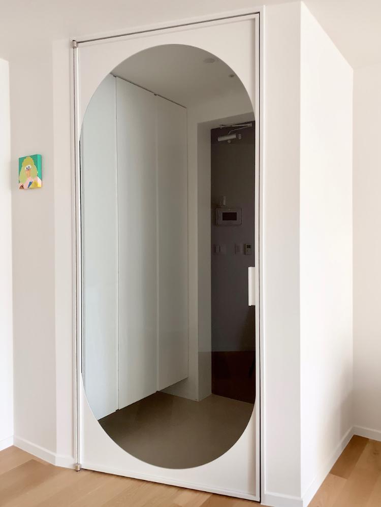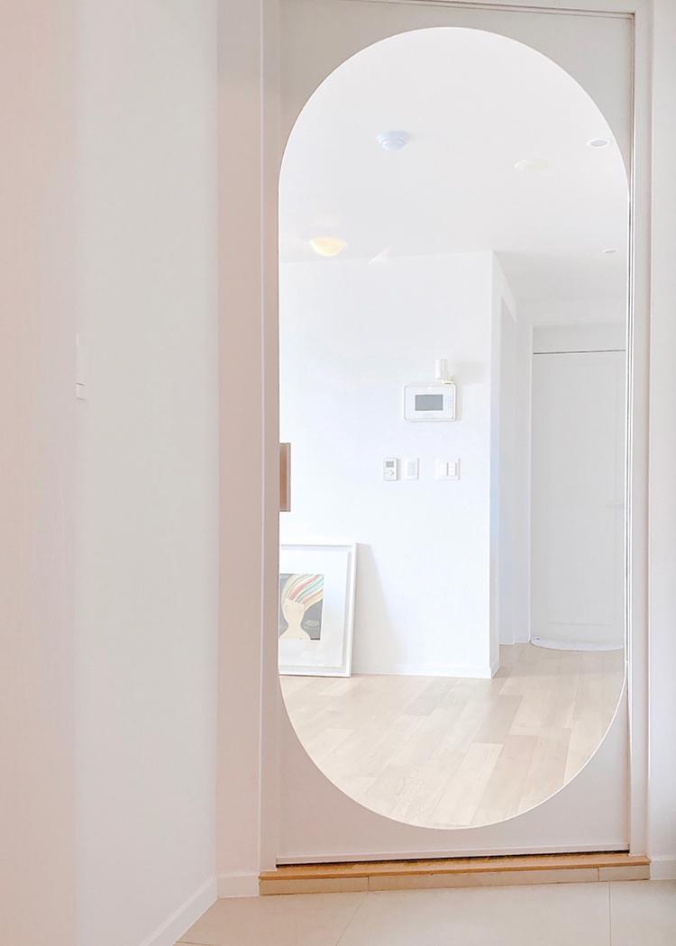 기존에 있던 신발장, 선반 그리고 타일까지 모두 철거하고 가벽을 세운 뒤 타원형의 귀여운 중문을 설치했어요. 복도식 아파트도 아니고 20평 대에 중문이 필요할까 싶어 많이 고민했었는데 기능적으로나 심미적으로나 마음에 쏙 드는 중문이에요.