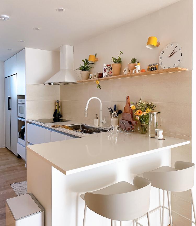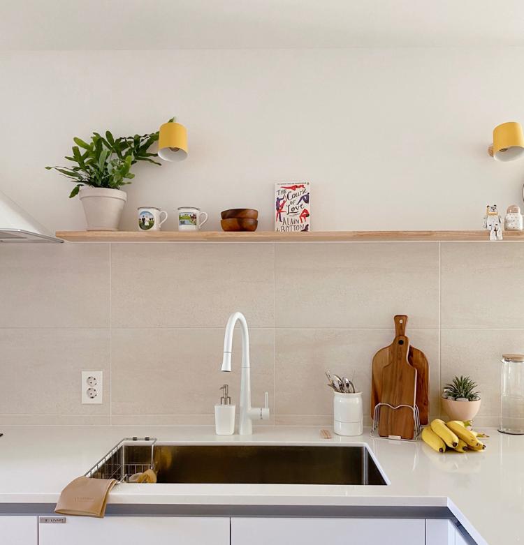 인테리어와 홈스타일링을 하면서 가장 많이 공들인 공간은 바로 주방이에요. 상부장 없이 벽등과 무지주 선반을 설치하는 것으로 틀을 잡고 몇 날 며칠을 벽등만 찾아 헤맸는데 ‘이거다!’ 싶은 조명을 발견했죠. 집의 포인트 컬러를 노란색으로 잡은 것도 바로 이 벽등에서부터 시작되었어요. 그렇게 직구한 노란 벽등과 무지주 원목 선반 그리고 턴키 사장님과 여러 번의 상담을 거쳐 고른 상아빛이 도는 타일. 이 모든 게 잘 어우러져서 따뜻한 느낌의 주방이 만들어졌어요.
