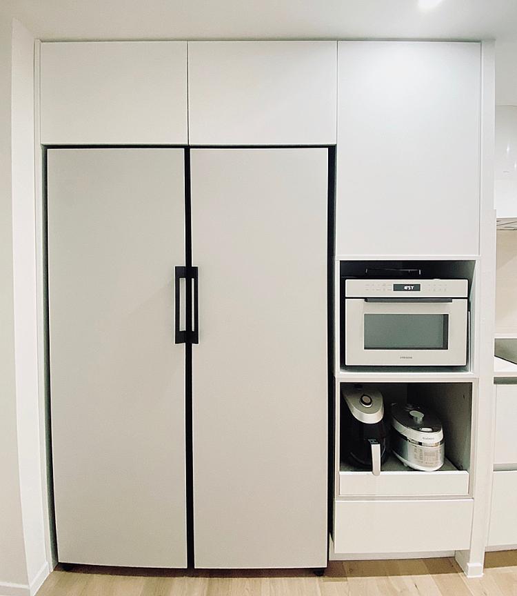 조리대 왼쪽 공간은 냉장고와 가전장이 자리 잡고 있어요. 냉동고와 냉장고는 삼성 비스포크 1도어 키친 핏 2개인데 구매했던 가전 사이즈를 미리 알려드려 그에 맞게 공사를 했기 때문에 맞춤 가구처럼, 말 그대로 비스포크 주방을 완성할 수 있었어요 :)