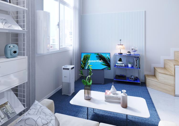 거실 소파 반대 쪽은 포인트가 되어주는 가전과 가구로 꾸며봤어요. 먼저, 유니크한 싱글라이프에 딱 어울리는 삼성 더 세로 TV! 콘텐츠에 맞게 세로, 가로 모드로 화면을 전환해주는 건 물론, 바퀴를 장착해 필요한 위치로 쉽게 옮길 수 있다는 점! 혼자 사는 싱글라이프에 딱 어울리는 TV가 아닐까 싶네요. 그 옆에는 강렬한 딥블루 컬러의 모듈 선반을 배치했어요. 유리 상판과 스테인레스 소재의 프레임이 더 시원함을 느끼게 해 주지 않나요?