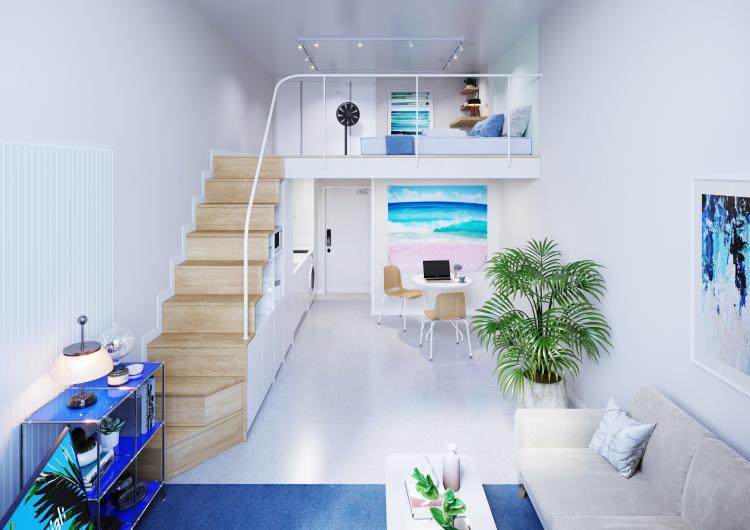 거실 반대 쪽 공간을 볼까요? 화이트로 더 깔끔하게 정돈된 주방과 우드 포인트의 계단으로 이어진 복층 공간이 더 시각적으로 확 트인 느낌을 주네요. 차가운 바다, 하늘, 바람을 연상시키는 블루 계열의 색상 포인트를 활용하는 것이 여름 인테리어의 포인트인데요. 같은 계열의 색상이면 조화가 어렵지 않기 때문에 포인트 색상을 통일하는 게 좋습니다.