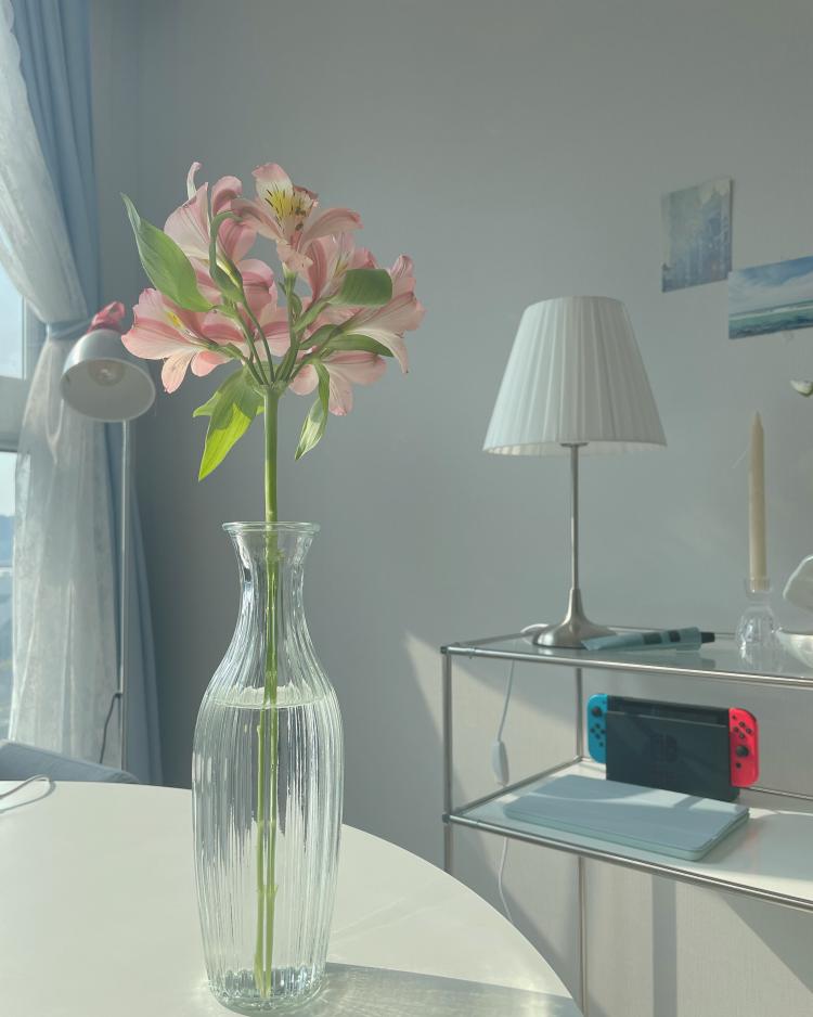 지금 화병에 있는 꽃은 스토크입니다. 햇빛을 봐서 조금 탄 것 같긴 한데 꽤 오래가더라고요.