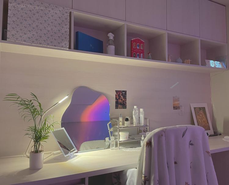 이쪽은 책상인데요. 긴 책상 공간을 반으로 나눠 한쪽은 화장대로 사용하고 있습니다! 저 비정형 거울 너무 예쁘지 않나요? 가격이 조금 나갔지만 저의 행복을 위해 투자했습니다.. 결과적으로는 아주 만족 중이에요
