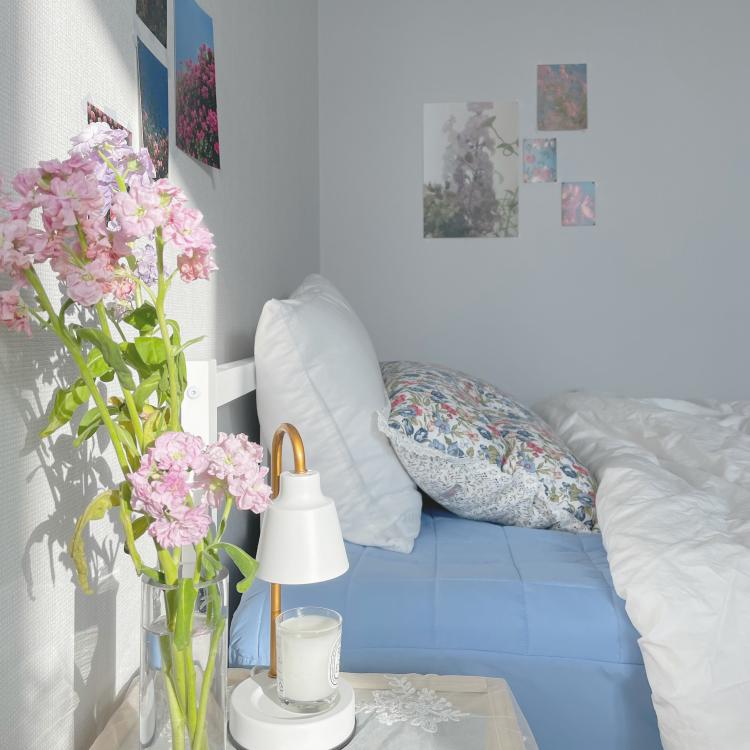 그 옆에는 남향이라 볕이 잘 들어오는 침실이 있어요. 저는 꽃을 좋아해서 베개커버를 꽃이 낭랑한 베개커버로 바꿔주고, 일주일에 한 송이씩 꽃을 사서 화병에 꽂아두는데요. 사실.. 꽃이 오래가지도 않고 가끔 벌레도 꼬이고 시들면 버릴 때마다 마음이 아프더라고요.