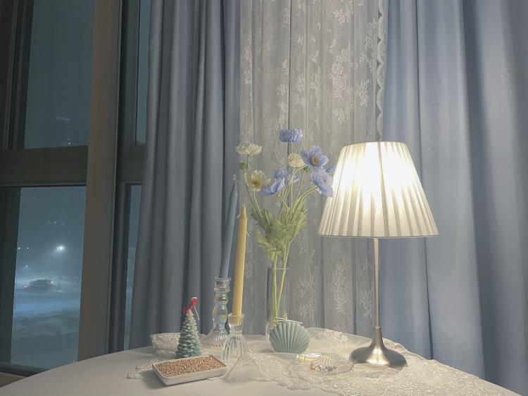 그래서 침대 프레임과 원형 테이블을 화이트로, 커튼 색은 하늘색 그리고 레이스 커튼으로 포인트를 줘야겠다고 생각하며 물품을 구매했어요. 곳곳에는 포인트가 될 하늘색 인테리어 소품도 놓아주었답니다. 배치가 끝났을 때 상상한 대로 그림이 나와줘서 너무 행복했어요