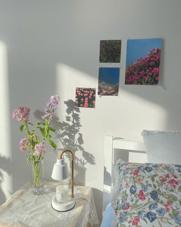 침대 위쪽에는 맘에 드는 꽃 엽서가 많이 없어서 포스터 말고는 제가 사진을 찾아 인화해 붙였어요