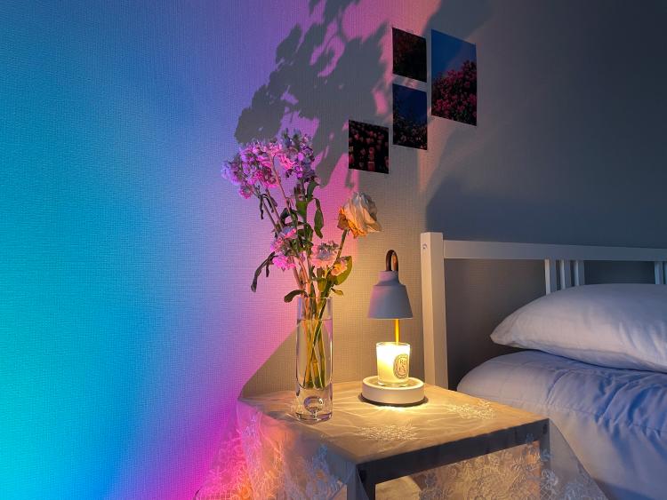 제가 가장 애정 하는 선셋 무드 등입니다. 저는 인테리어의 8할은 조명이라고 생각하는 사람이라서, 집에 조명이 좀 많은 편인데요. 이 무드 등은 정말 잘 산 것 같아요! 이 조명만 켜면 분위기가 확 바뀌면서 자취방이 200% 사는 느낌이에요. 플래시를 터트려 사진을 찍으면 괜히 힙해 보이기도 하고요. 너무 예쁘지 않나요?