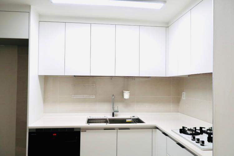 손잡이가 따로 없는 디자인의 싱크대라 깔끔하고 더 넓어보이도록 떨어져요. 주방 후드 또한 보이지 않도록 매립형 후드를 선택했고, 주방 타일은 유행을 타지 않는 베이지 컬러로 선택을 했어요. 본래 밝은 그레이 톤의 무광 타일을 선택하고 싶었는데 청소가 어려울까 걱정되어 유광을 선택하게 되었어요.