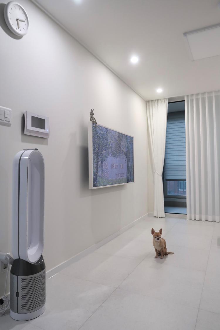 올 화이트 인테리어라 포인트로 액자를 두고 싶었는데 액자를 둘 공간도 좁은 25평 아파트라 액자처럼 연출할 수 있는 티비를 구매했어요.