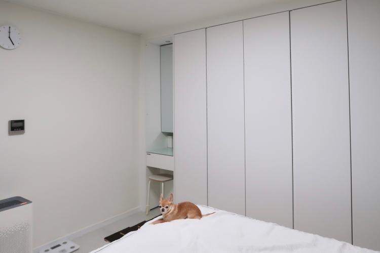 안방이 크기가 커서 붙박이장을 설치했어요. 다른 아파트라면 안방에 안방 화장실과 드레스룸, 파우더룸이 있을텐데 저희 집은 그런게 따로 없어 붙박이장과 붙박이 화장대를 짜서 넣었어요.
