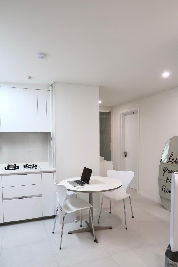 본래 ㄷ자로 아일랜드 식탁을 설치할까 고민도 많이 했는데 주방에서 거실로 이어지는 통로에 아일랜드 식탁을 두면 더 좁아보일 것 같아 고민하다 작은 식탁을 두었어요.
