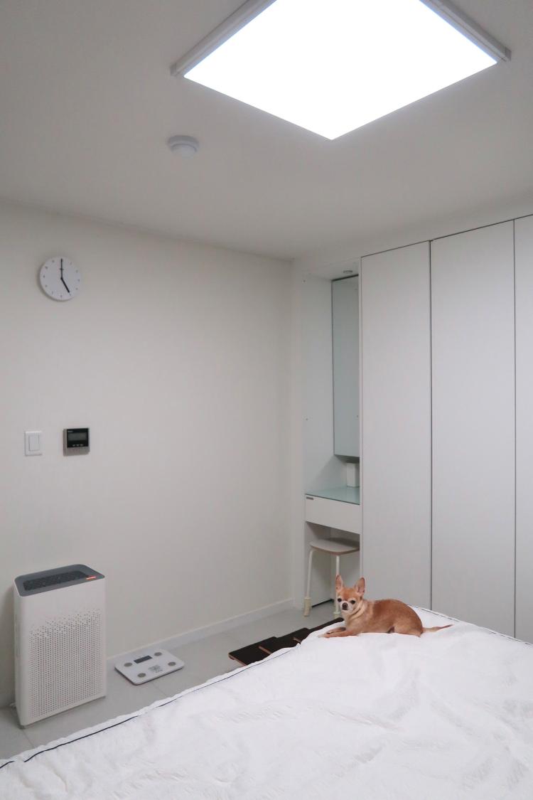 다른 가구를 둘 넓은 공간은 없지만 강아지가 이용할 강아지 계단, 강아지 털이 많이 날려 공기청정기는 필수로 두어야 해서 놨어요. 그리고 안방에도 시계가 필요하였는데 예쁜 시계도 선물 받았어요.