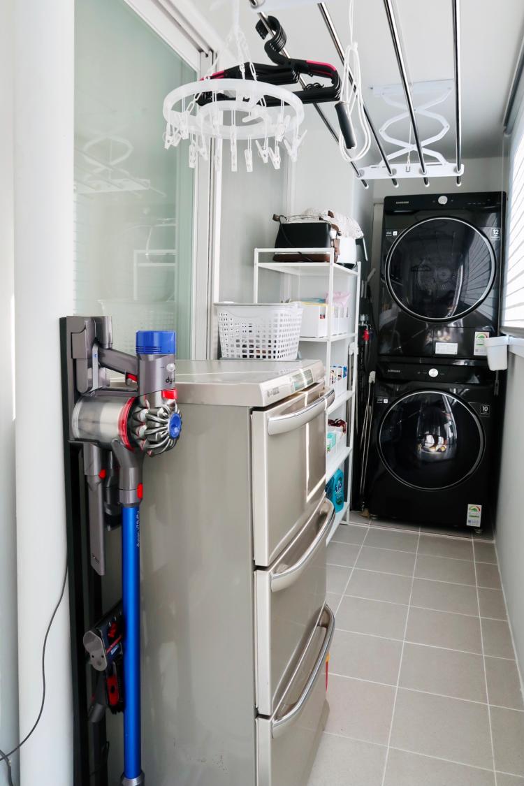 김치냉장고를 주방에 두고 싶었는데 주방이 협소해 그러지를 못했는데 다행이도 베란다에 둘 공간이 나더라구요. 게다가 이쪽에 콘센트가 있어 청소기를 두기에도 좋구요.