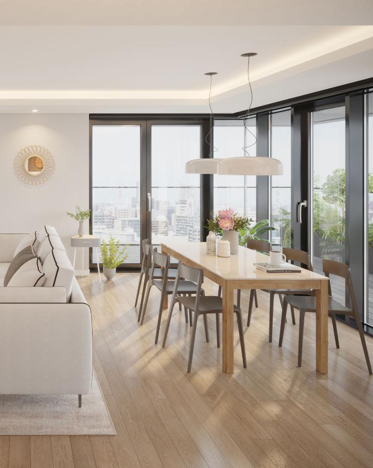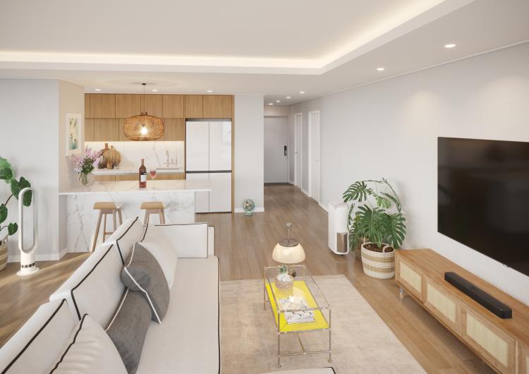 거실 한 켠에는 큰 원목 테이블을 두고 다이닝룸을 꾸며, 자녀들과 함께 생활하는 대 가족에 맞는 라이프스타일을 즐길 수 있도록 연출했어요. 간단한 티 타임을 즐기거나, 저녁 식사 모임을 함께 해도 멋진 공간이 되겠죠?