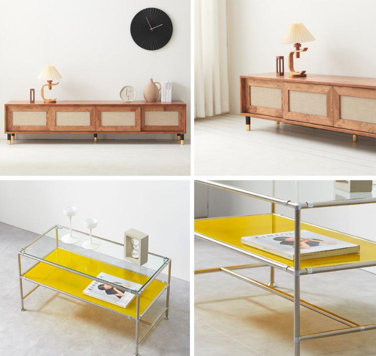 거실장은 라탄 슬라이딩 도어가 적용된 미닫이 거실장으로 수납이 편리하면서 우리 집에 감성을 한 스푼 더해 줄 보루네오 거실장입니다. 소파 테이블은 스테인리스 파이프 프레임이 차가우면서도 시원함을 더해주는 가구 데코의 유리 소파 테이블인데요. 모던한 느낌은 물론, 노란색 강화유리 상판이 제대로 인테리어의 포인트가 되어주지 않나요!