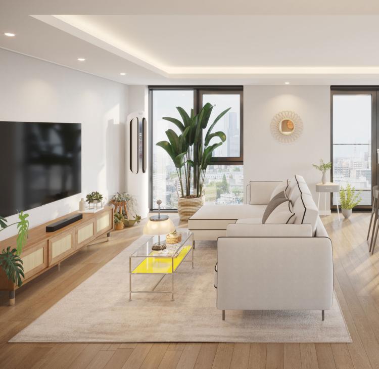 벽걸이 TV로 공간의 무게감은 줄이고, 단정한 느낌으로 배치된 거실 공간 속에 러그, 조명, 오브제, 화분 등으로 포인트를 주었는데요. 특히 싱그럽고 푸른 느낌이 가득할 수 있게 다양한 식물들을 배치했어요. 벽 끝으로 갈 수록 키 큰 식물을 배치하고, 가구 옆에는 가구 높이와 비슷한 높이의 식물을 배치하면 안정감 있는 배치를 완성할 수 있어요. 플랜테리어는 공간의 활기를 더해주는 효과 뿐만 아니라, 공기 정화와 습도를 조절해주며 심신 안정의 효과까지 줄 수 있는 아주 훌륭한 인테리어 방법이랍니다.