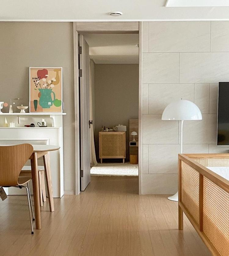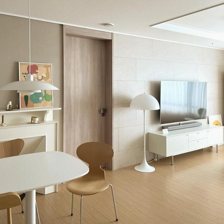 기존 벽지와 바닥이 오크우드 베이지 톤으로 무난하게 깔끔한편이라 인테리어 구도잡기가 많이 어렵지 않았어요