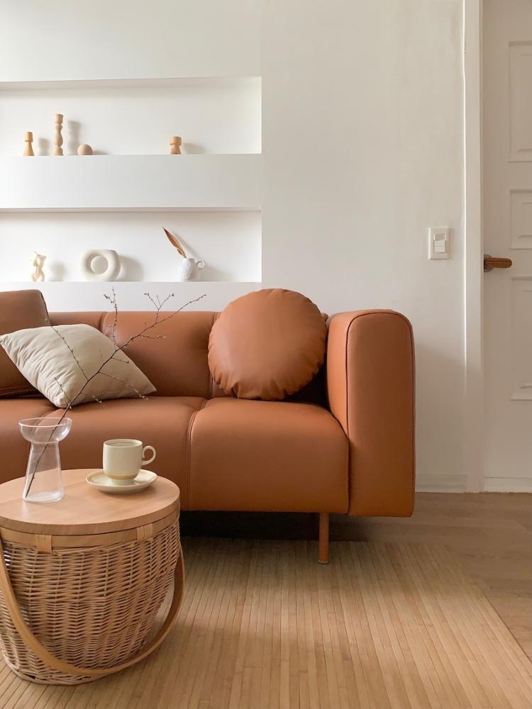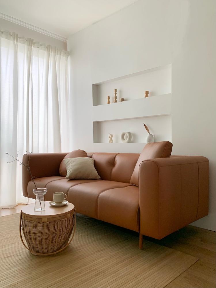 원래는 모듈소파가 있었는데 컬러감 있는 브라운 가죽소파로 거실에 변화를 주었고, 밋밋했던 한 쪽 벽면에는 남편과 카페에서 보던 오브제존을 남편과 함께 직접 만들어 보았어요.
