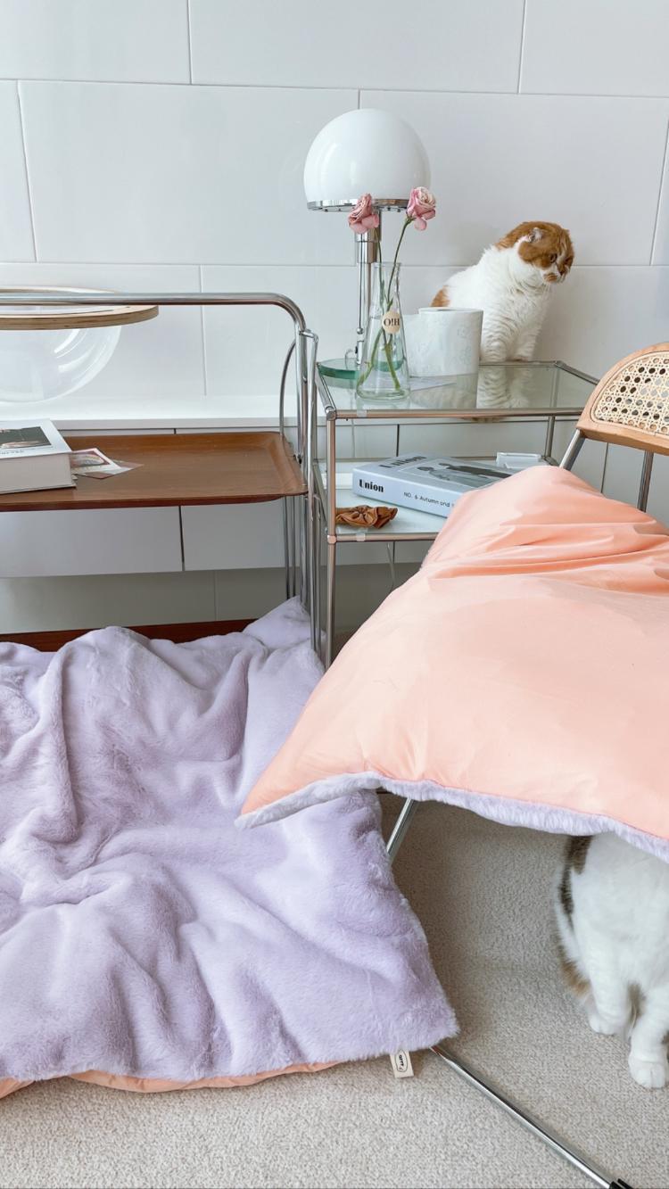 새롭게 변화한 거실의 모습입니다! 러그와 침대 하나만으로 눈의 띄는 컬러의 공간 포인트가 완성되었습니다. 모듈가구와 소파의 재배치를 이용하여 또다른 모습을 보여주셨는데요. 두 모습 다 감각적인 모습이네요:)